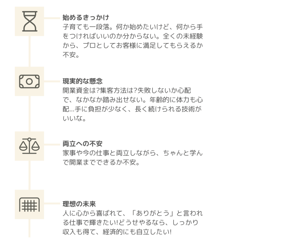 「子育て一段落後、何か始めたいと思 っていましたが不安でした。ワンドマ ユの実践的なカリキュラムのおかげ で、今では月に30名以上のお客様に ご来店いただいています。」(40代‧ 女性)
