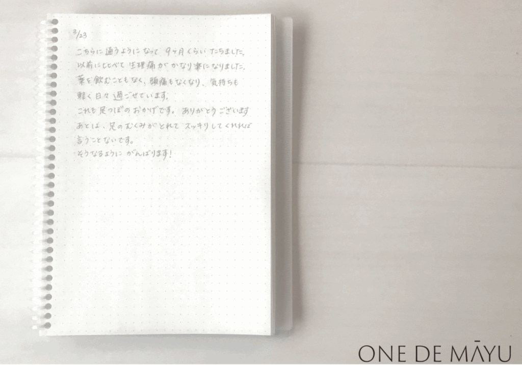 あれだけ悩んできたPMSが嘘のようになくなって、びっくり!麻由さんについてきてよかった〜って思いました。仕事にも集中できるし本当によかったです。