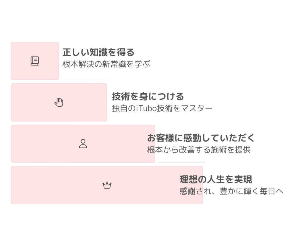 一般的な手技のスクールでは決して学ぶことができない、創設 者 梶原が自身の経験から開発した、専用道具を使うワンドマユ だけの唯一無二の技術、それが『iTubo』です。